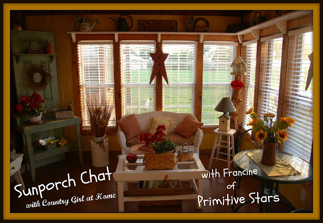 Thank you all for stopping by and joining us on the sunporch. I hope you enjoyed the visit, the apple pie, and the coffee. :) You know I always love your comments here, but be sure and also stop by Francine's blog, Primitive Stars, and say hi and I know she'd love for you to follow along with her on her blog as well!
